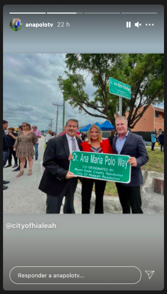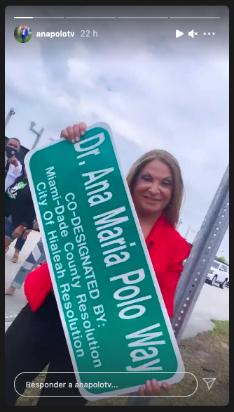 La abogada y conductora del aclamado programa “Caso Cerrado”, no pudo ocultar su alegría al renombrar un calle de la ciudad Hialeah como “Calle Dra. Ana María Polo”. Así lo reveló en sus redes sociales, donde se mostró junto al nuevo cartel que decorará la vía ubicada en Miami Dade, frente al estudio que por casi 20 años fue sede del aclamado espacio judicial que esta condujo.