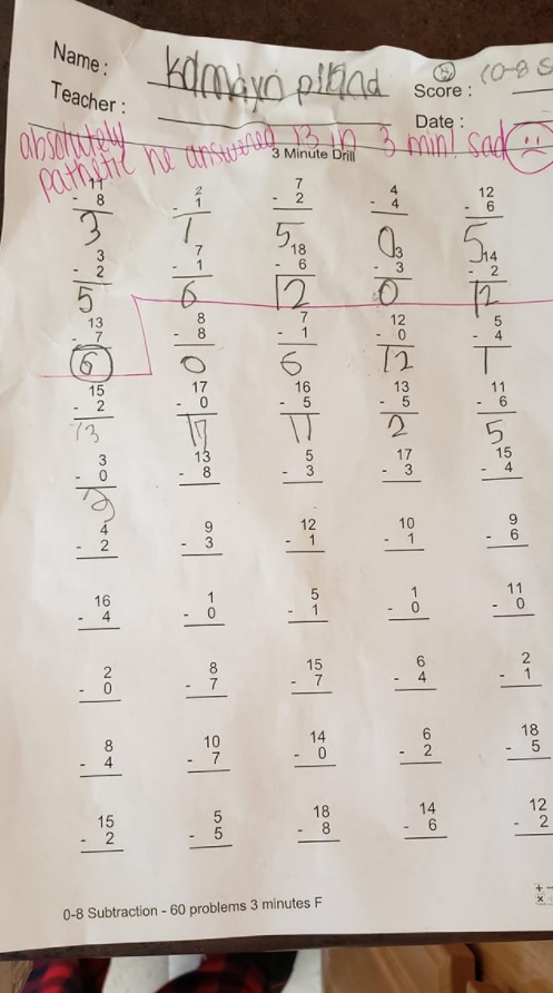 Se trató de Alyssa Rupp Bohenek, profesora de segundo grado quien había desafiado a sus estudiantes a resolver la mayor cantidad de ejercicios matemáticos posibles en una determinada cantidad de tiempo. La mujer que tras la clase, corrigió las tareas y dio su revisión, sorprendió a la familia del pequeño Kamdyn que recibió una inesperada frase.
