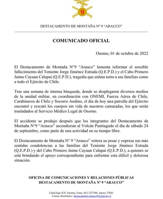 Durante la tarde de este sábado se confirmó el hallazgo de los cuerpos de los dos militares que se encontraban perdidos en el volcán Puntiagudo. Los militares del Destacamento de Montaña Arauco de Osorno se encontraban desaparecidos desde el 25 de septiembre.
