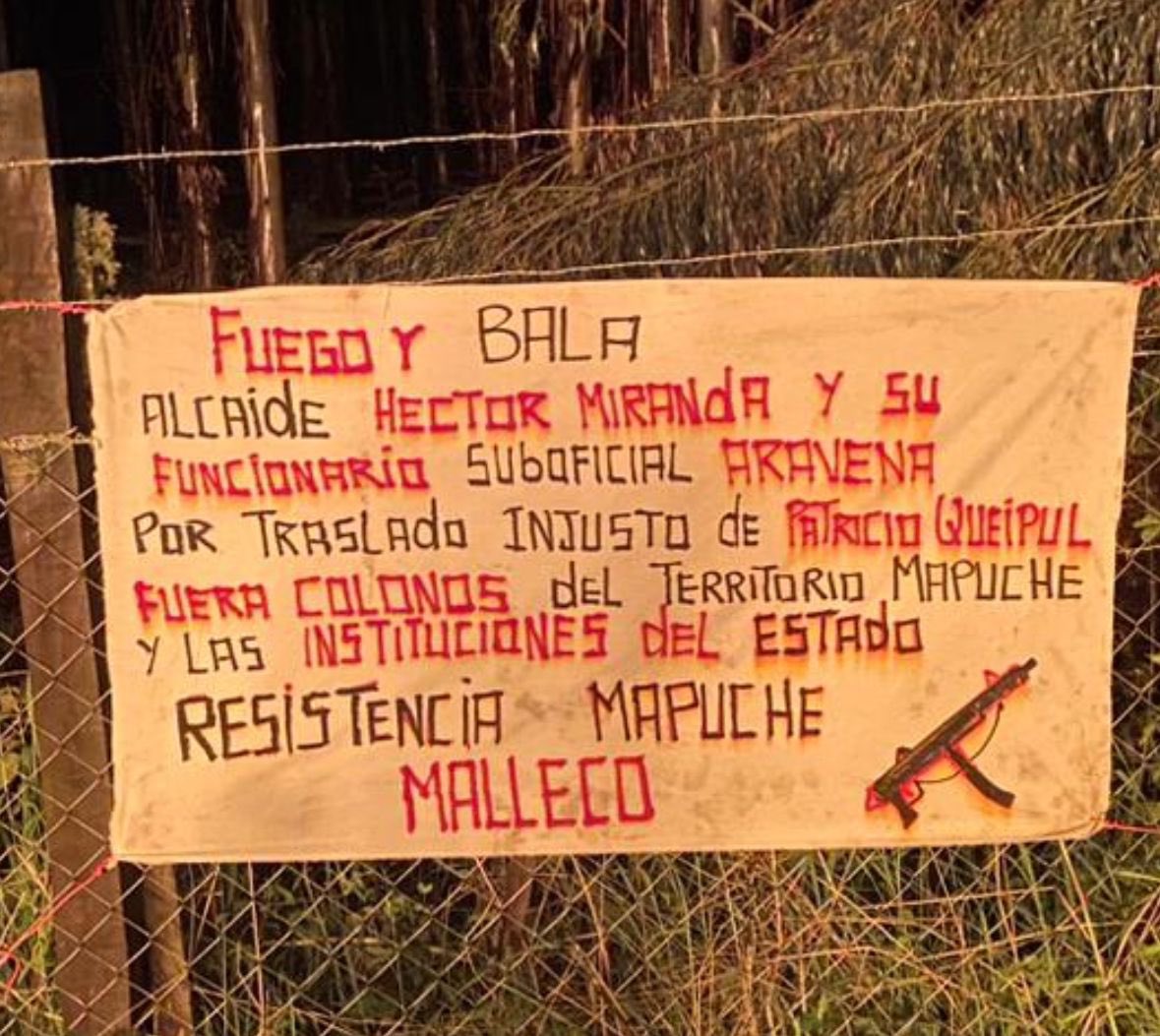 Uno de los letreros exige la salida de colonos del territorio mapuche y la liberación de los presos mapuches. Otro, por su parte, contiene amenazas dirigidas al alcaide de la cárcel de Angol, tras el traslado de un comunero mapuche desde esa comuna a la cárcel de Temuco.