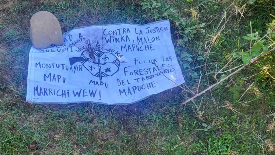 Adicionalmente, en el sitio del ataque incendiario se halló un lienzo con consignas que expresaban claramente: "fuera las forestales de territorio mapuche".