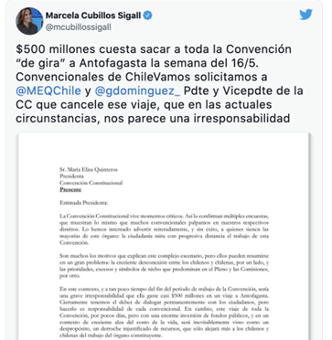 Días atrás, la convencional Marcela Cubillos compartió en Twitter una carta dirigida a la presidenta de la Mesa de la Convención, María Elisa Quinteros, pidiéndole, en nombre de los 20 representantes de Vamos por Chile, la cancelación de esta gira, argumentando una irresponsabilidad considerando el contexto económico del país.