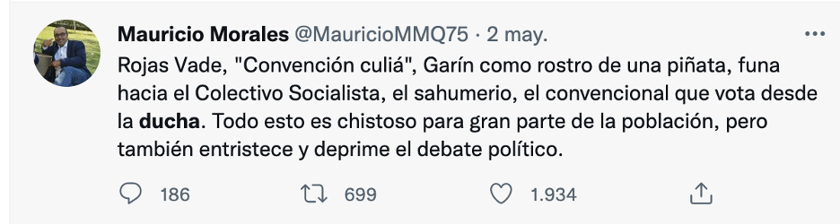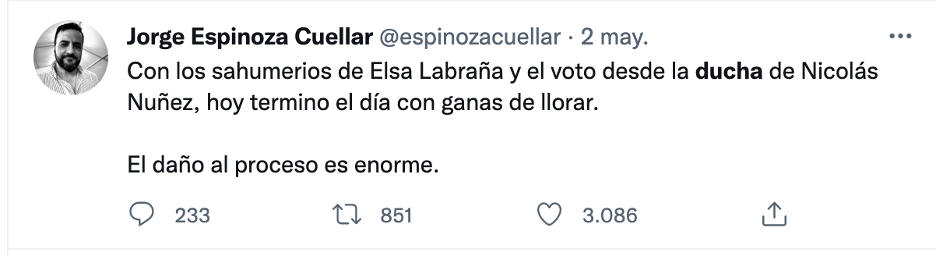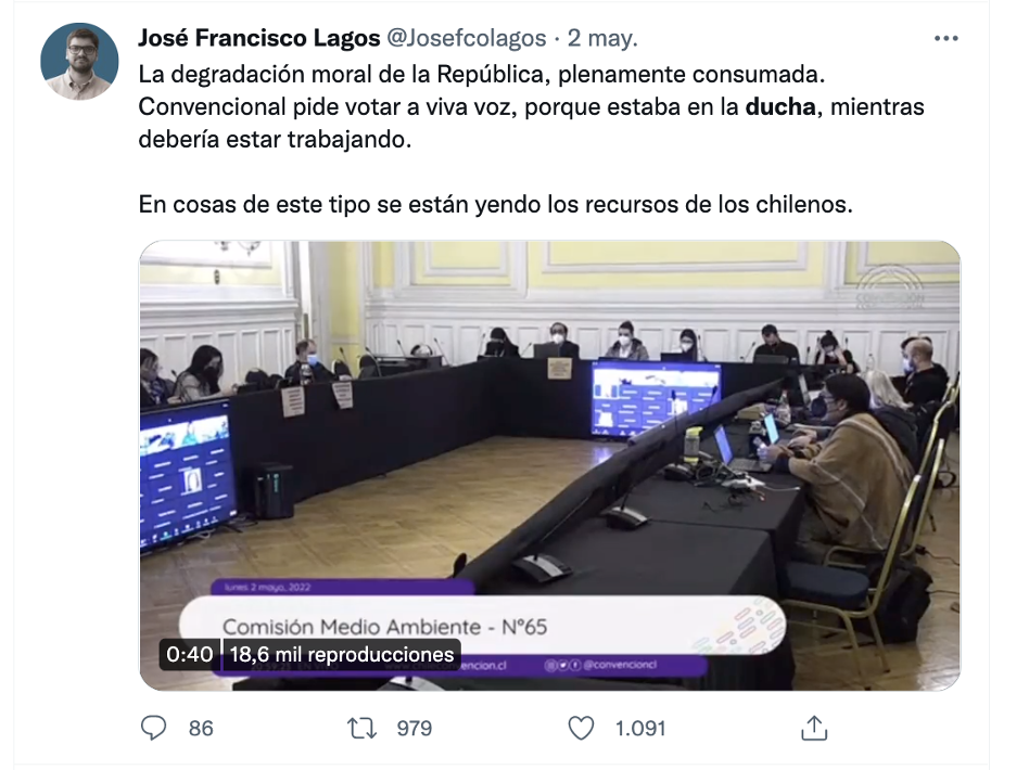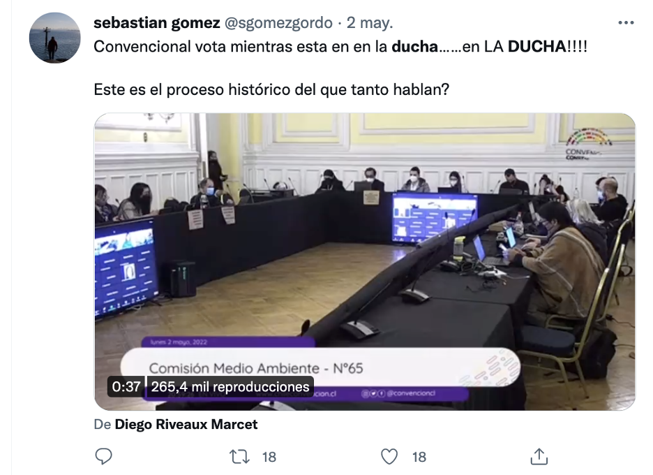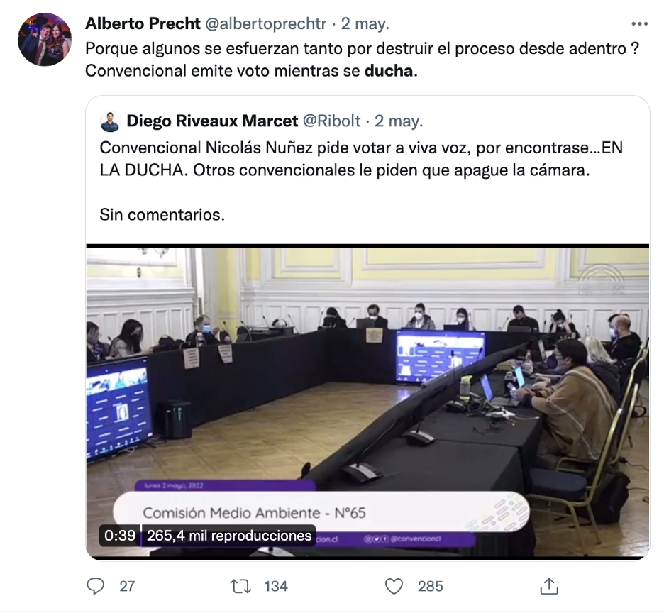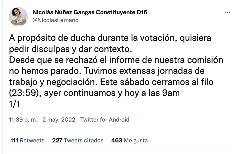“Señor secretario puedo emitir mi voto a viva voz, me estoy duchando”, fueron las palabras que usó el convencional Nicolás Núñez para excusarse de la votación del segundo informe, durante la sesión de la comisión de Medio Ambiente, despertando una ola de críticas e indignación transversales, que se manifestaron en diversas redes sociales, especialmente en Twitter.