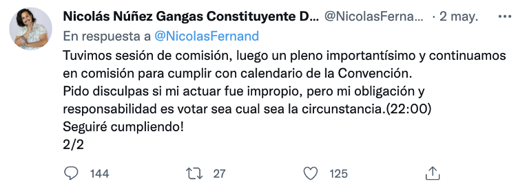Tras ocurrido este episodio, y conocidas las críticas transversales, Núñez pidió disculpas a través de su Twitter. “Pido disculpas si mi actuar fue impropio, pero mi obligación y responsabilidad es votar sea cual sea la circunstancia”, mientras agregó “desde que se rechazó el informe de nuestra comisión no hemos parado”.