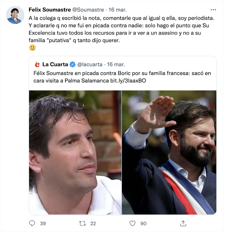 El periodista y ex chico Reality, Felix Soumastre, está en picada contra la Convención. En su canal de Twitter @Soumastre dedica ácidos comentarios al Gobierno del Presidente Gabriel Boric y muy especialmente al grupo de los 155 que escribe la propuesta de una Nueva Constitución.
