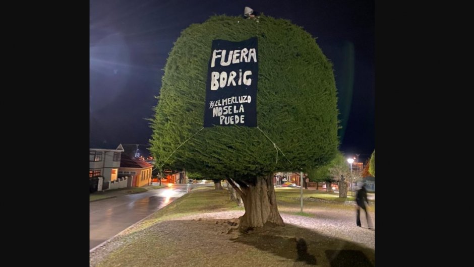 “Fuera Boric. #ElMerluza no se la puede”, se lee en la pancarta instalada en un ciprés de Puna Arenas, ciudad natal del jefe de Estado, cuyo registro ha sido difundido a través de redes sociales.