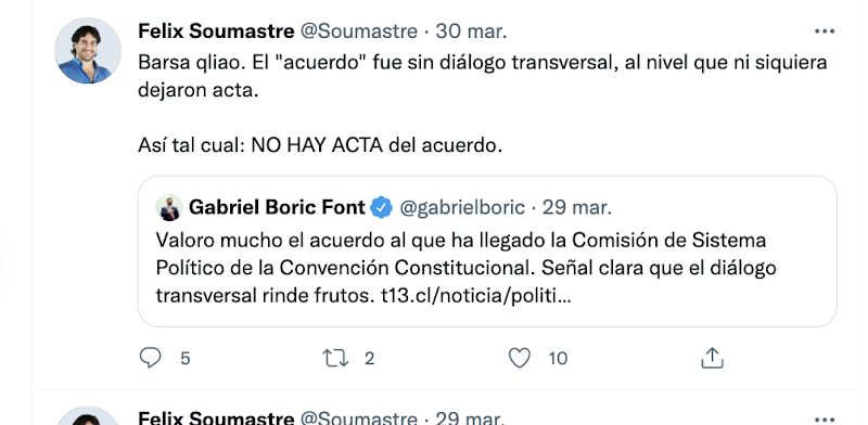 El periodista y ex chico Reality, Felix Soumastre, está en picada contra la Convención. En su canal de Twitter @Soumastre dedica ácidos comentarios al Gobierno del Presidente Gabriel Boric y muy especialmente al grupo de los 155 que escribe la propuesta de una Nueva Constitución.