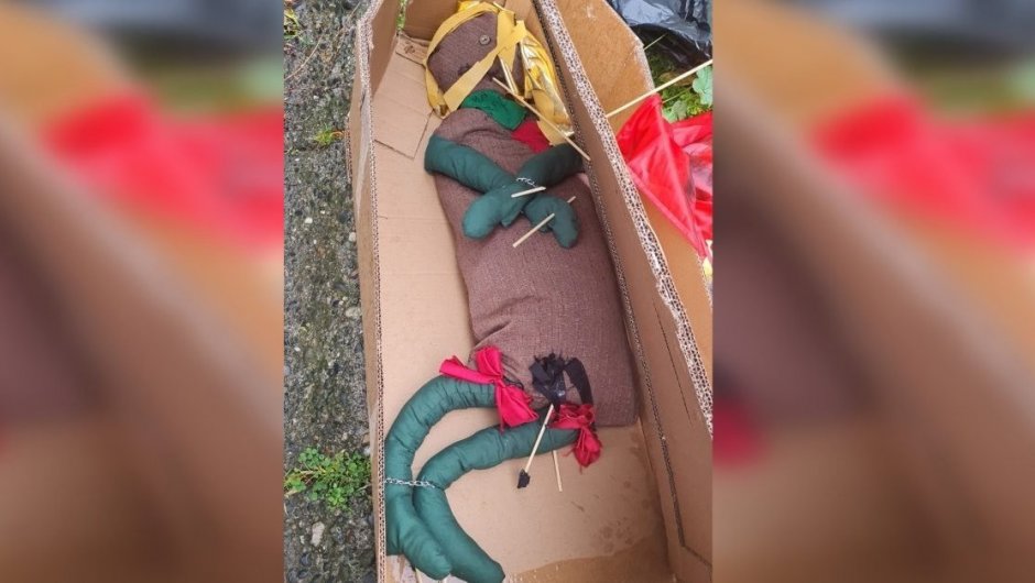 Se trató de una caja de cartón simulando un “ataúd” que contenía un muñeco café con cabello amarillo, que tiene sus brazos y piernas atacadas con cadenas, además de diversos palitos de madera pinchando partes de su cuerpo y una bandera del PC con mensajes ofensivos.