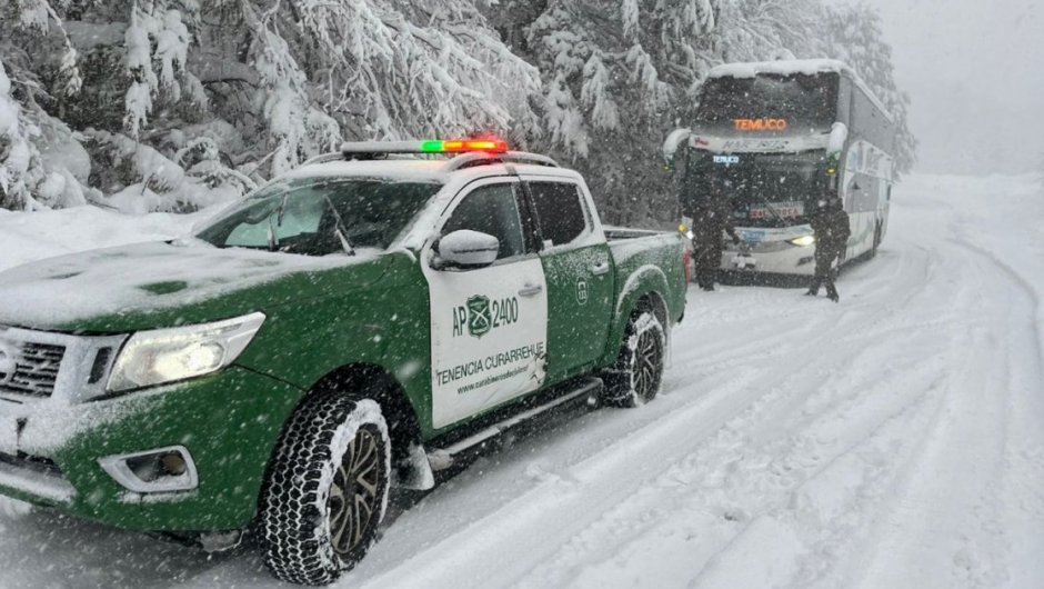 Personal de Carabineros rescató a 91 personas cuyos buses quedaron atrapados en la Ruta CH-199 de la comuna de Curarrehue en la región de La Araucanía, producto de las intensas nevadas.
