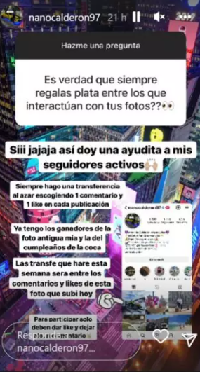 Nano Calderón sorprendió a sus seguidores con una inesperada revelación. El influencer, hijo de Raquel Argandoña, regala dinero entre sus seguidores "más activos" en Instagram.