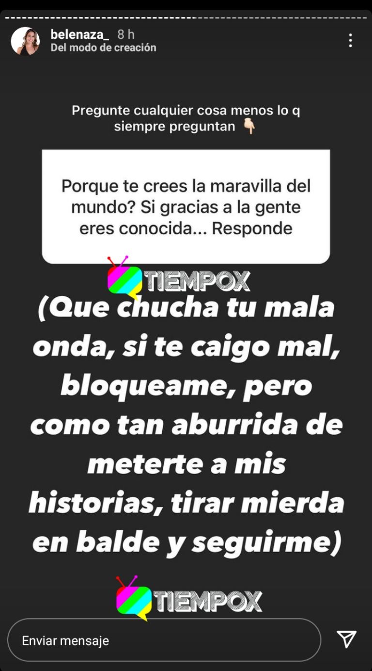Belén Mora respondió a seguidora que la acusó de creerse “la maravilla del mundo”