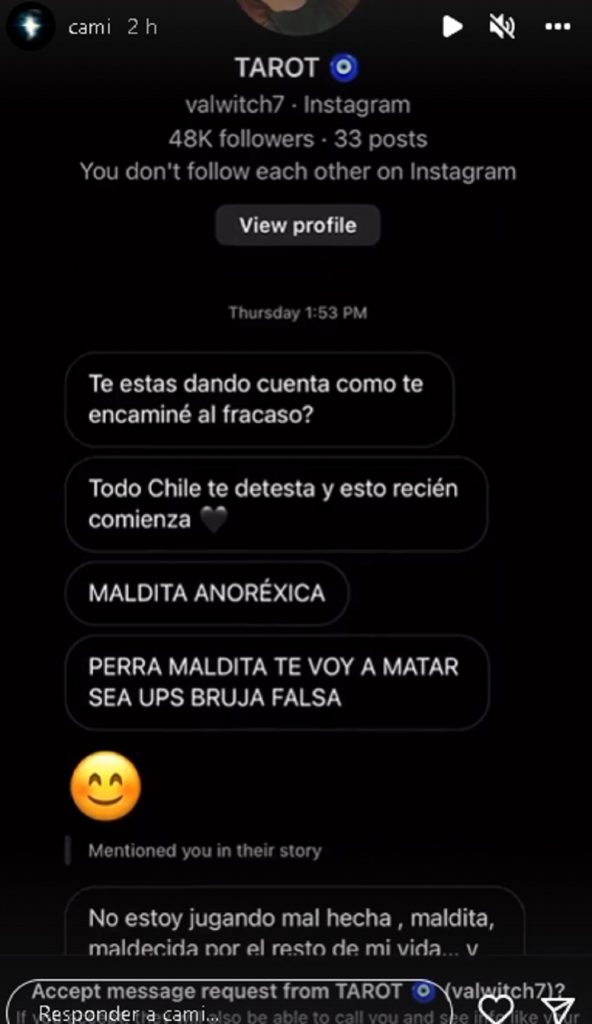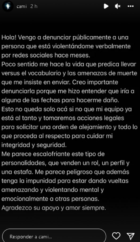 Esta situación llevó a que Cami escribiera un texto, donde se refirió a esta situación de acoso, la cual estaría sufriendo hace bastante tiempo.