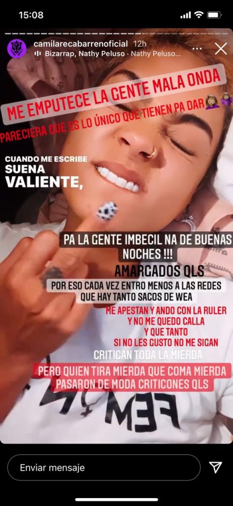 “Me emputece la mala onda. Pareciera que es lo único que tienen pa’ dar” comenzó diciendo la “influencer”, quien luego destacó que debido a las criticas, cada vez tiene menos ganas de aparecer en redes sociales. “Por eso cada vez entro menos a las redes, que hay tanto saco w…”, destalló Recabarren.