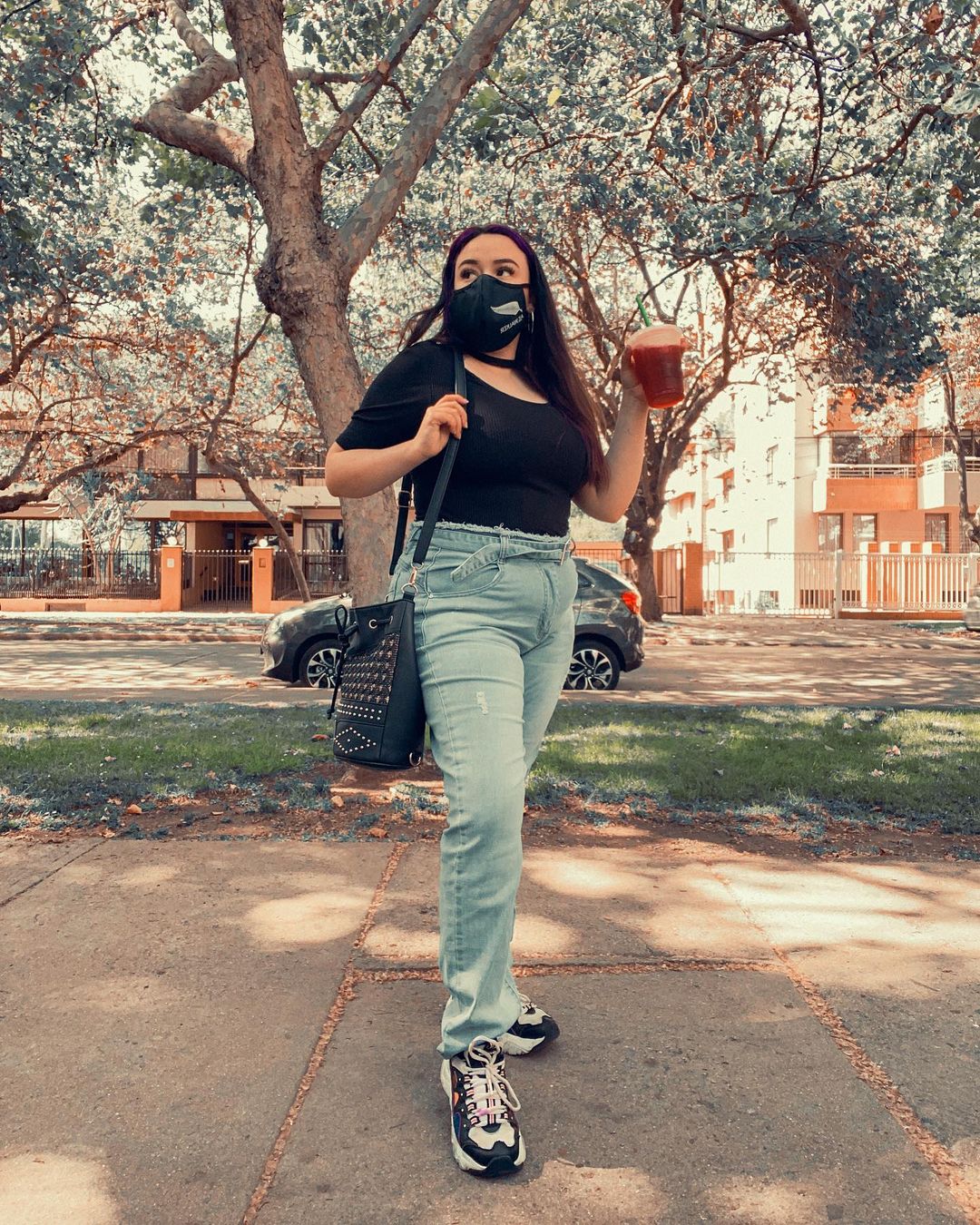 En su ultima publicación, la interprete de “Mueve el ombligo” sacó a relucir su lado fashion, posando con zapatillas, jeans tiro alto y una pollera negra con la que acentúa su silueta.