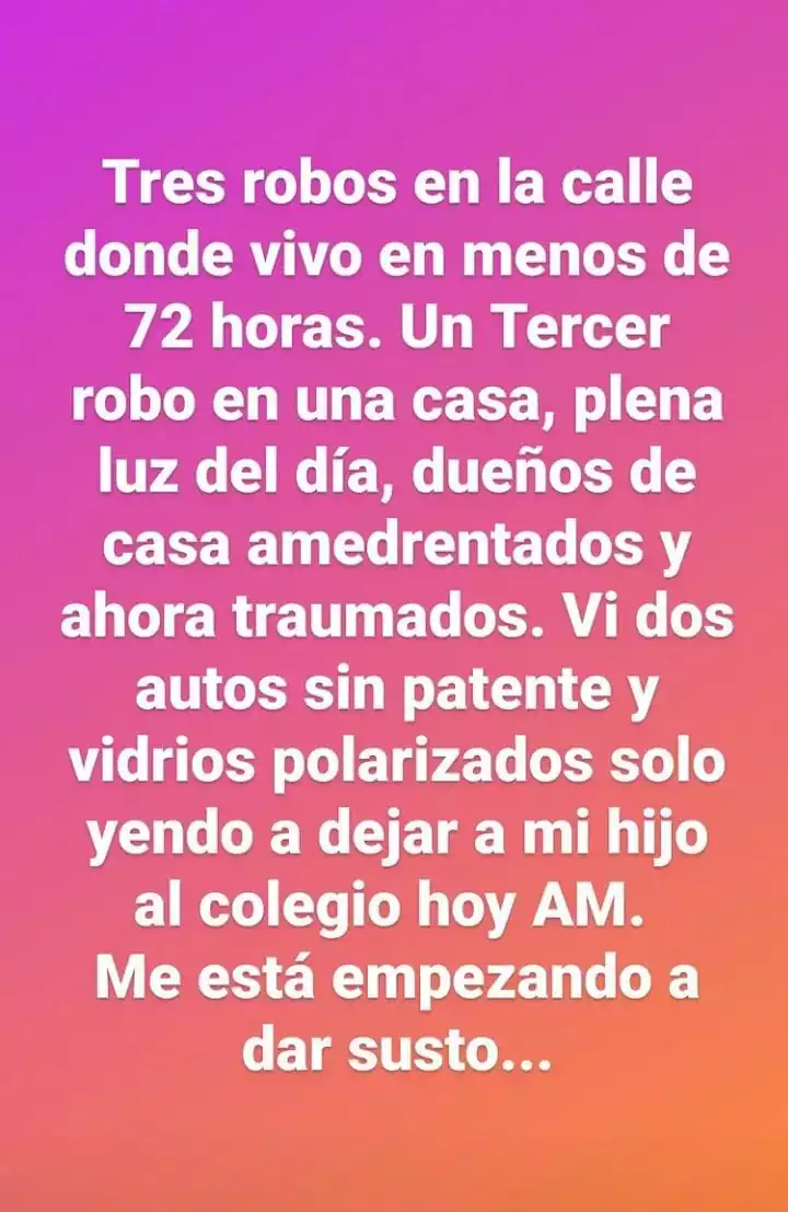 “Tres robos en la calle donde vivo en menos de 72 horas. Un tercer robo en una casa, a plena luz del día, dueños de casa amedrentados y ahora traumados”, señaló el actor en una de sus redes sociales.