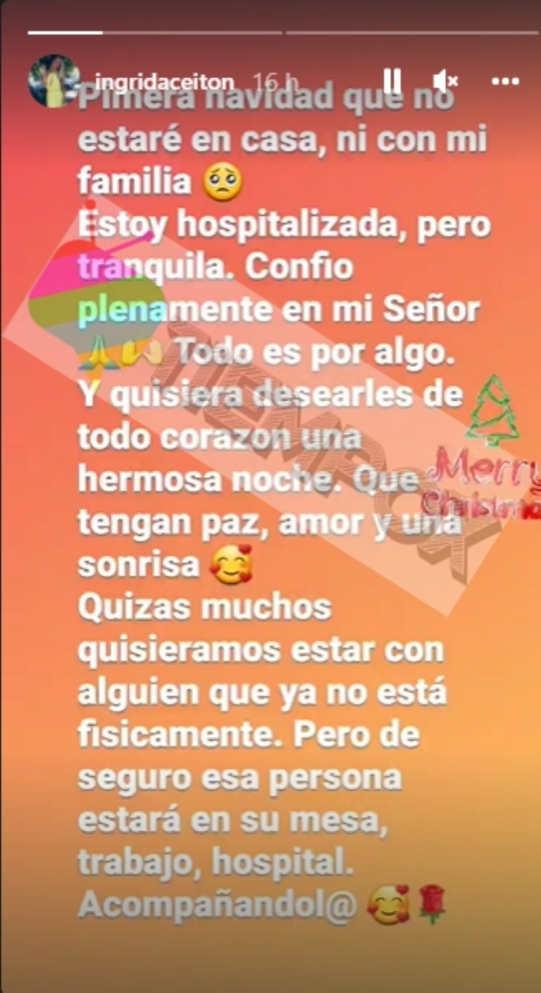 Pese a lo anterior es que ayer 24 de diciembre, en sus historias escribió que "primera Navidad que no estaré en casa, ni con mi familia. Estoy hospitalizada, pero tranquila. Confío plenamente en mi señor, todo es por algo y quisiera desearles de todo corazón una hermosa noche", partió diciendo.