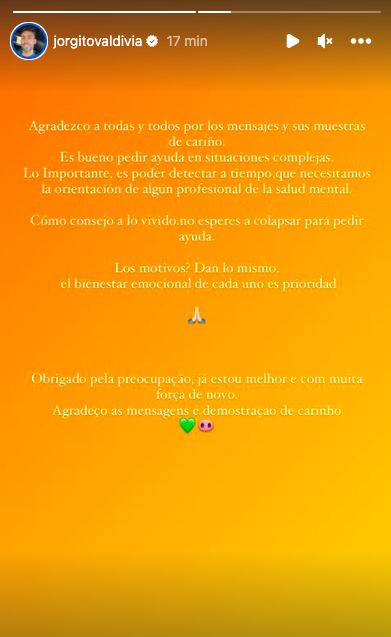 En su cuenta de Instagram, compartió una "historia" donde agradeció "a todas y todos por los mensajes y sus muestras de cariño".