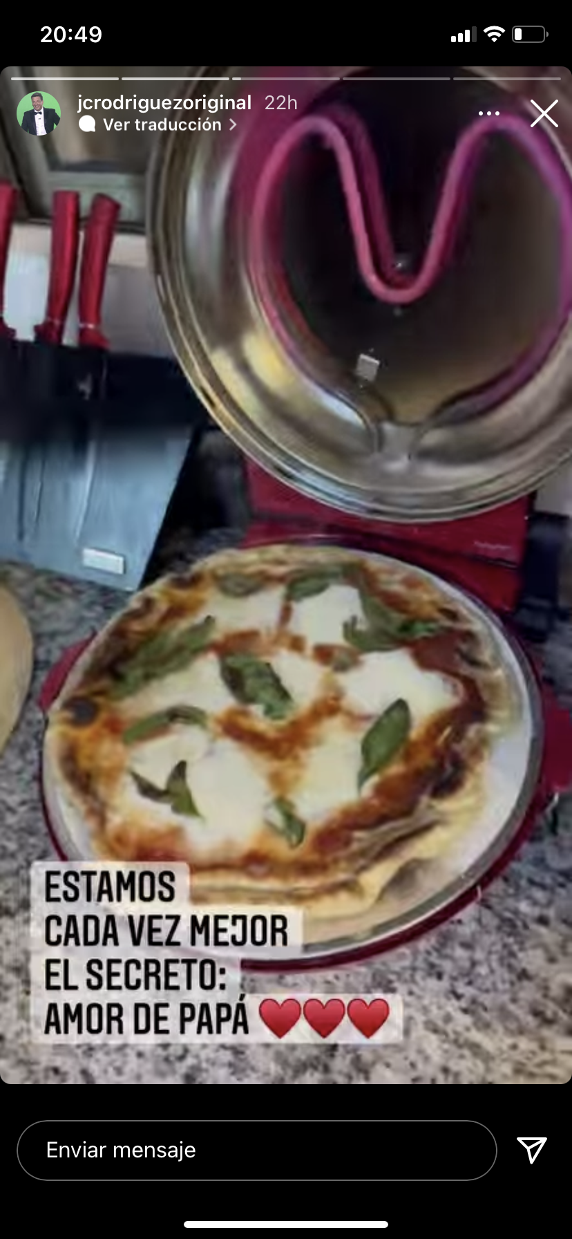 “Voy a comer un salmoncito, pepino, brócoli, que tengo que comer todos los días, y tomate cherry” agregó después mostrando la dieta que lleva y que luego complementó con una pizza de masa madre hecha por el mismo: "Estamos cada vez mejor. El secreto: Amor de papá", cerró señalando JC Rodríguez.
