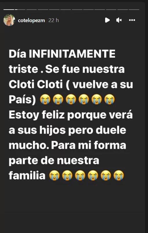 “Día infinitamente triste, se fue nuestra Cloti Cloti (vuelve a su país). Estoy feliz porque verá a sus hijos, pero duele mucho. Para mí, forma parte de nuestra familia”, escribió María José López en sus redes sociales, haciendo referencia a su asesora del hogar.