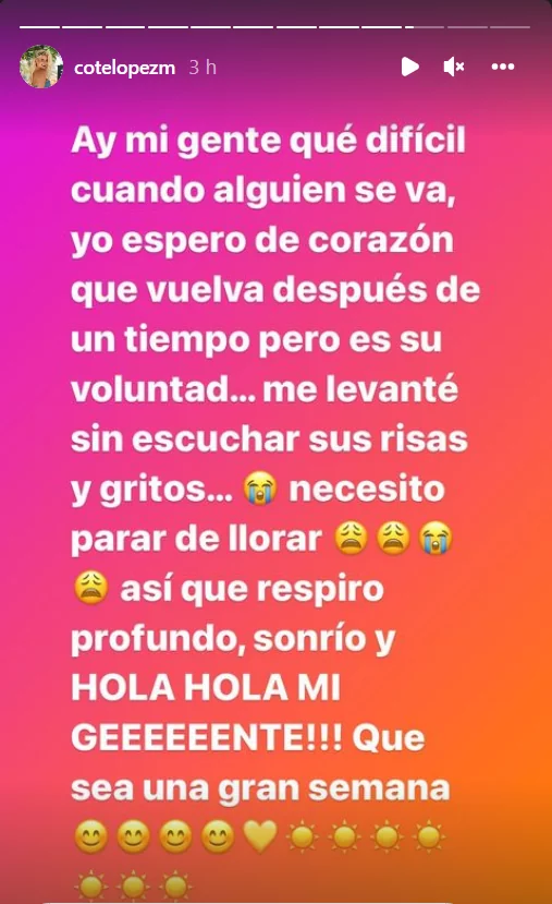 "Qué difícil cuando alguien se va, yo espero de corazón que vuelva después de un tiempo, pero es su voluntad. Me levanté sin escuchar sus risas y gritos. Necesito para de llorar, así que respiro profundo", añadió en otra historia de su cuenta de 'Instagram'.