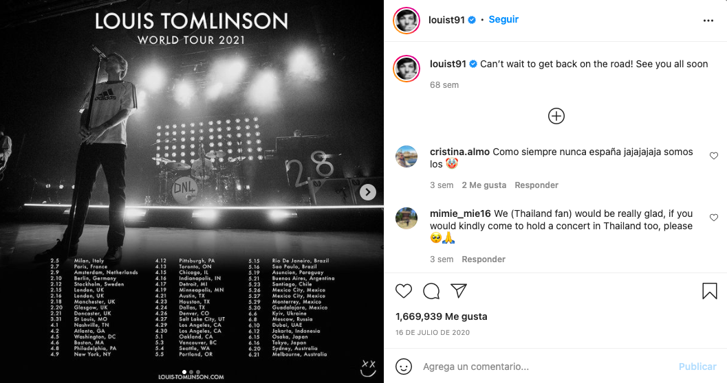 Tomlinson presenta su primera gira en solitario con su disco “WALLS”, el que fue lanzado en enero de 2020. El cantante ha alcanzado el sorprendente hito de los mil millones de reproducción en Spotify.