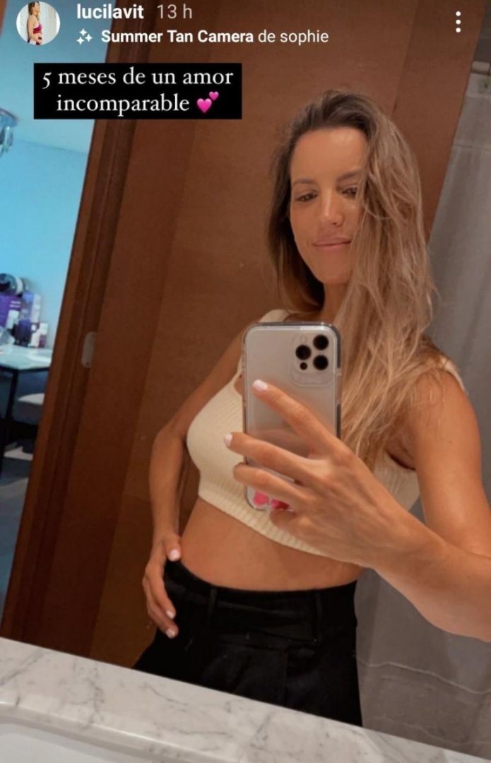 En una nueva publicación de sus redes sociales, Lucila posó frente a un espejo en el baño de su casa, dejando su mano en su pequeño vientre de cinco meses, en donde crece su futura hija, la que se llamará Agustina Olarra Vit.