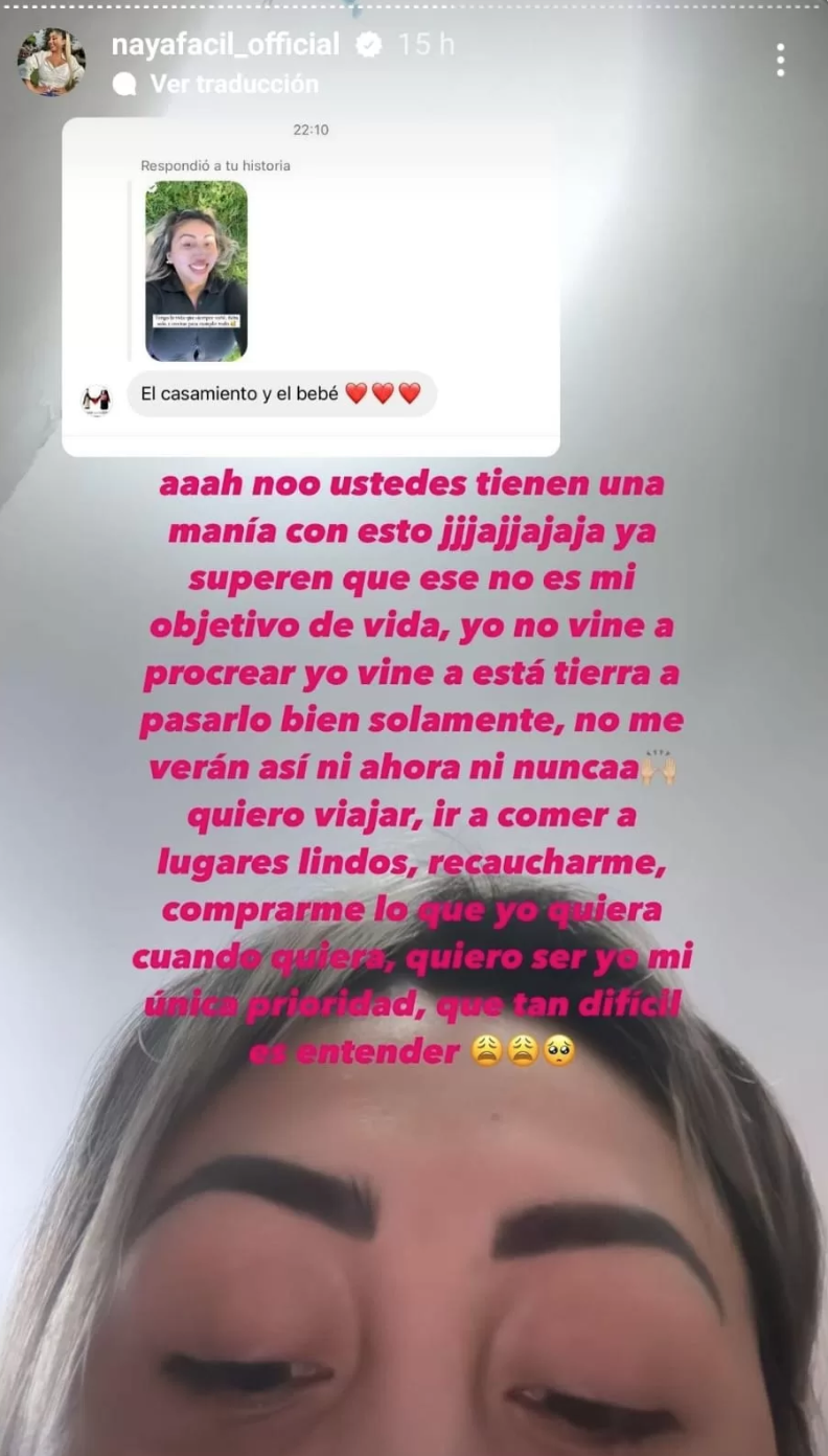 Con firmeza, Naya Fácil afirmó: “Yo no vine a procrear, yo vine a esta tierra a pasarlo bien solamente. No me verán así ni ahora ni nunca. Quiero viajar, ir a comer a lugares lindos, recaucharme, comprarme lo que yo quiera cuando yo quiera. Quiero ser mi única prioridad, qué tan difícil es de entender”.