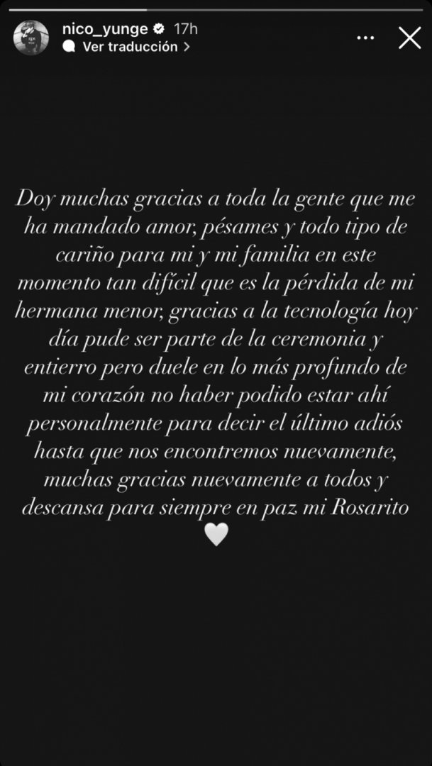 Finalmente, volvió a agradecer a sus seguidores por los mensajes de cariño y cerró con un mensaje para su hermana: "Descansa para siempre en paz, mi Rosarito".